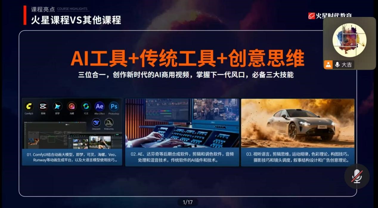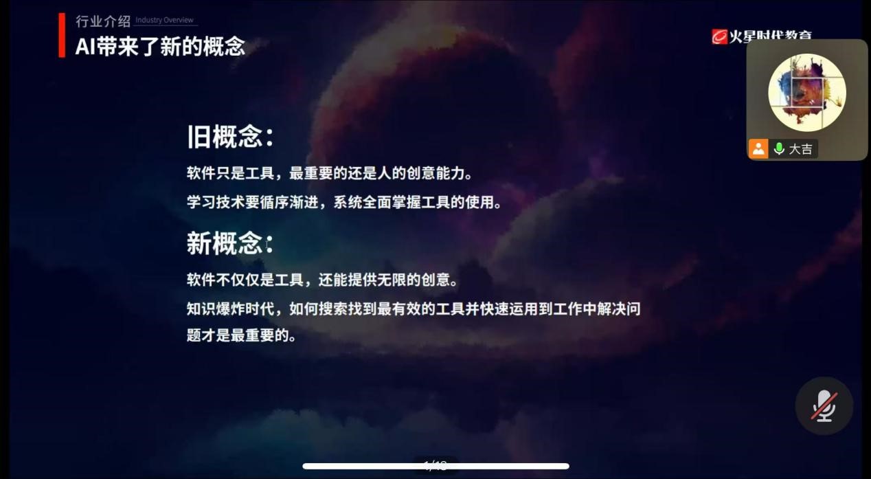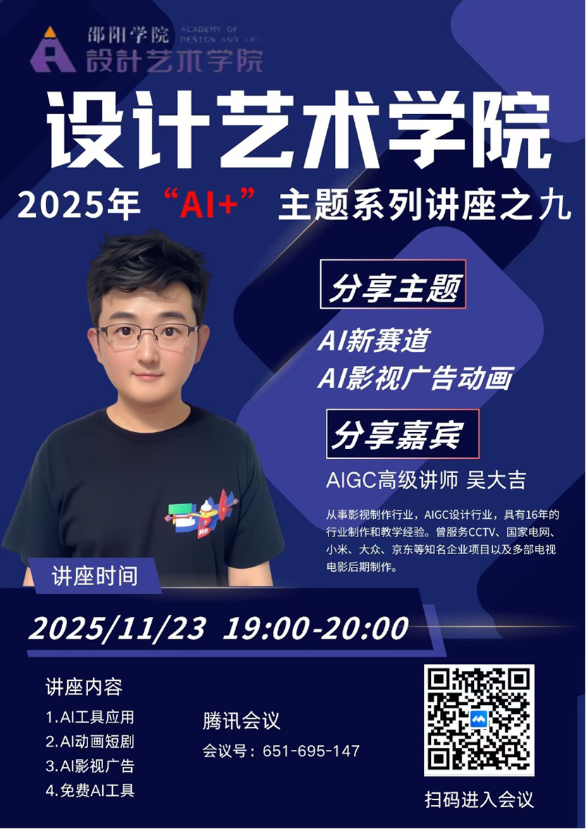 11月23日晚,设计艺术学院“AI+”主题系列讲座第九场以线上形式顺利举行。本次讲座以“AI赋能创作革新,重塑设计学习新认知”为主题,特邀AIGC高级讲师吴大吉担任主讲。
