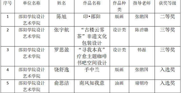 本次作品展,设计艺术学院共选送9幅作品参赛,最终有5幅作品脱颖而出,斩获荣誉。其中,张鹏国老师指导的学生陈旭的版画作品——“印·邵阳”,荣获二等奖;陈碧璐老师指导的学生张宇航的设计类作品——“古楼云雾茶”非遗文化包装设计、韩磊老师指导的学生罗思盈的设计类作品——“寻我本真”疗愈主题咖啡书吧空间设计,分获三等奖;谢朝玲老师指导的学生俞思洁的油画作品——“南风知我意”、与张鹏国老师指导的学生饶舒逸的版画作品——“手中兰”,也成功拿下入选奖。