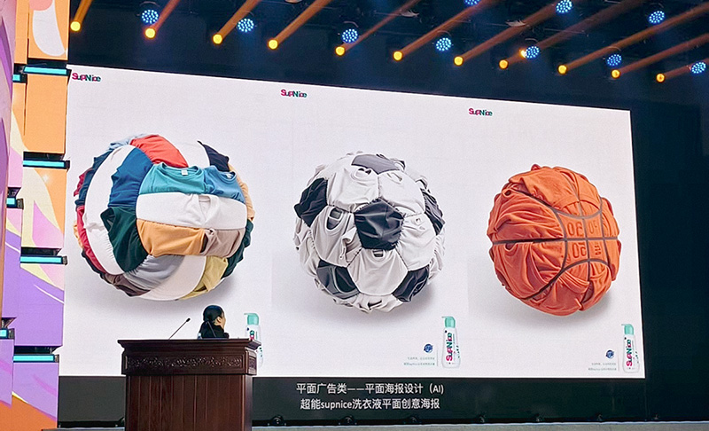 尤为引人注目的是,在颁奖现场,今年会设计艺术学院学子创作的《超能supernice》洗衣液平面创意类海报(平面广告类——平面海报设计AI)被评委作为优秀案例进行专门点评,凸显了作品的专业水准与创新价值。